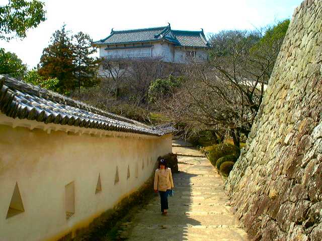 | Steps leading up to the main part of the castle. My friend from Japan is there walking up the steps. Note the various holes in the wall to her right. These would of been protective positions taking up by warriors to defend the walls and entry ways with both musket rifles and bows & arrows. |