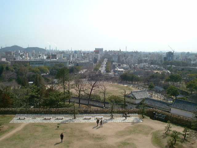 | A view outside one of the lower windows of the main towers of Himeji Castle. The is to the south over looking the courtyard below, with the old area in the clearing area beyond that. And in the distance you can see the modern city of Himeji. |