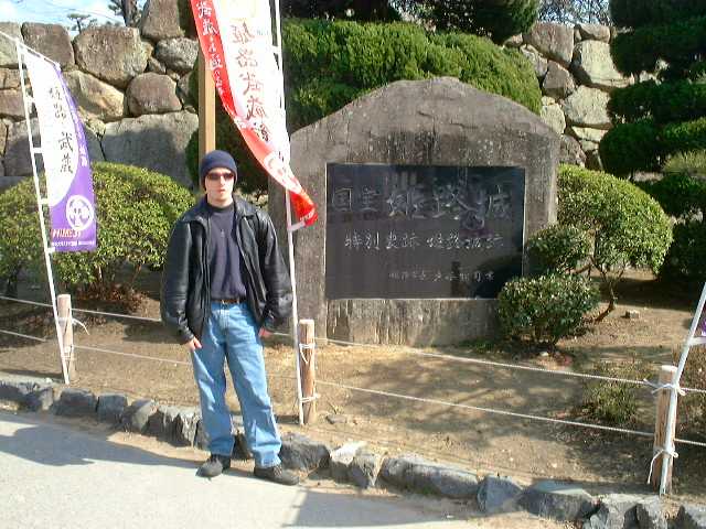 LJR standing next a monument which reads, 'National Treasure Himeji Castle'. It also notes this place as being a hisorical place of special interest.