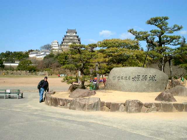 LJR standing next a monument which reads 'World Heritage Himeji Castle'. You can see the castle itself off in the background behind me.