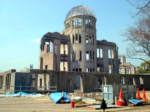 | This is a very visual reminder of what the A-bomb did to this city, as the Japanese have left it as it was since that day, August 6, 1945 at 8:15am. This place is now called, ,the 'A-Bomb Dome'. At the time of the bombing it housed the branch office of the Chugoku Shikoku Public Works Office of the Internal Affairs Agency and the offices of the Hiroshima District Lumber and Japan Lumber Control Corporation. |