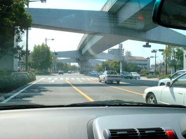 | Driving around the streets of Hiroshima looking for Peace Park. In this pic you can see the underside of the monorail tracks. Its know as the 'Skyrail' - a sort of monorail-gondola hybrid and was completed in 1999. |