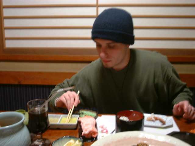 | I'm sure I was a pain in the ass for the shop workers, but I wanted my friend to experience the sauce I use and show other Japanese when I'm in Japan to eat crab with. Melted butter, with squeezed lemon, and a few dashes of salt. Our hosts at the resturant were nice enough to comply. Here I am taking my first dip in the lemon butter sauce. |