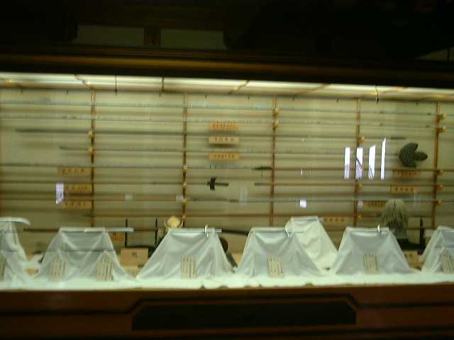 A frontal view of the spear case with various spear tips on display at the bottom.