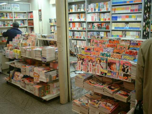 | In Japan with a literacy rate of 90%, you often find many shops like this. Note the Men's Magazines to the right there, much like the adult magazine in the western world but of course this being Japan censored. Also you may see listed here one of many phone book sized Manga magazines. |
