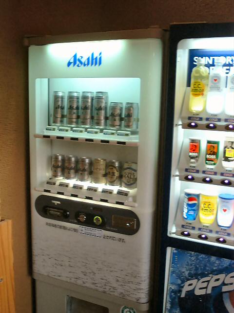 | Ah yes.. my eyes alight with envy. A vending machine that sells beer!! We used to have these in the U.S. a long time ago, but not anymore. This also happens to be my all-time favorite beer. 'Asahi Super-Dry'. You can find these on street corners and road side stands through out Japan. To give you an idea about size, the 2 cans on the top right, are the size of normal Coke cans in the U.S. |