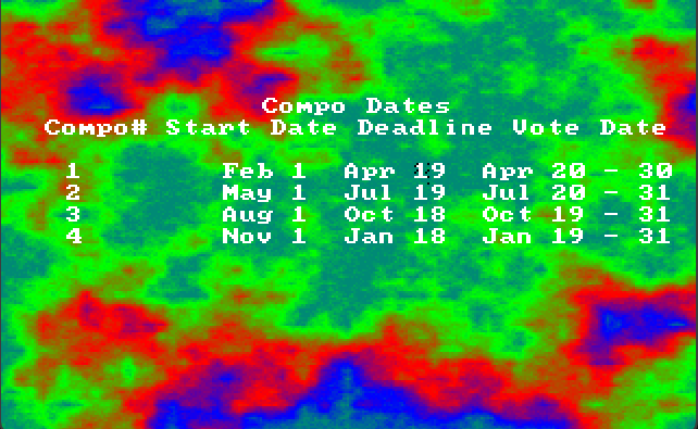 If you have any questions, or suggestions, please email Lord Jon Ray. We are open to suggestions. Information Overide would like to keep this thing BIG and going once every 3 months. At the begining of every 3 months, those compos requiring packs will be available the 1st of the 1st compo month But all the intros, trak music, artwork and ANSI submissions must be done by a single artist or coder.