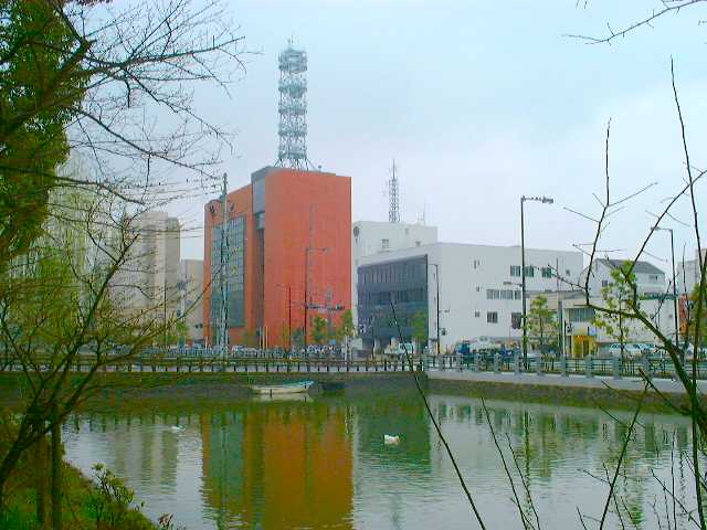 The city scape of downtown Matsuyama from across the moat that used to surround part of the old walled city below the castle.