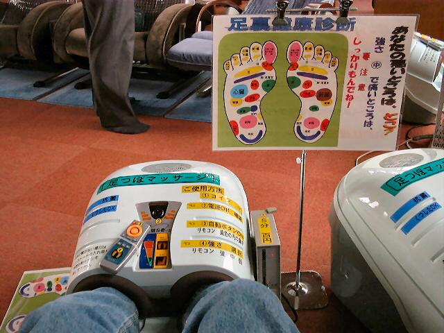 | Hmm more stuff here than I care to translate! :) But it basically instrtucts you on the use of these foot massagers. Yen operated of course, also it points out the different pressure points on the foot it works for you. I decided to give it a go, and try this while I relaxing before I entered the hot spa. |